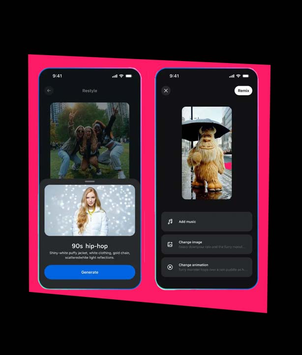 Auch Meta ist eingestiegen: Mit „Vibes“ experimentieren sie mit einem KI-Video-Feed in der Meta-AI-App. Die Clips werden automatisch erzeugt, lassen sich remixen und der Feed passt sich nach und nach an den Geschmack der User an.