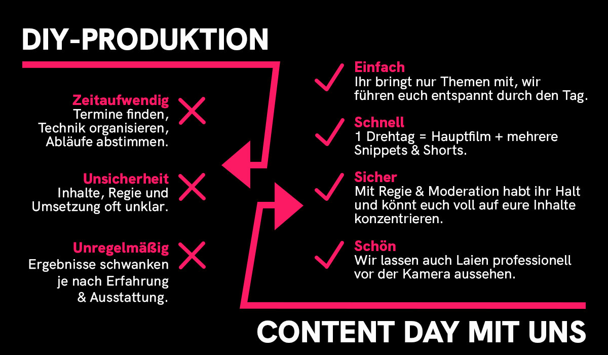 DIY kostet Zeit und Nerven (Termine, Technik, Abstimmung) und liefert oft unterschiedliche Ergebnisse. Beim Content Day mit uns wird’s einfach, schnell und sicher: Sie bringen Themen mit, wir führen durch den Tag – Ergebnis: professioneller Output vom Hauptfilm bis zu Snippets & Shorts, auch für 9:16. Zusätzlich sorgen wir dafür, dass auch Laien vor der Kamera gut aussehen.